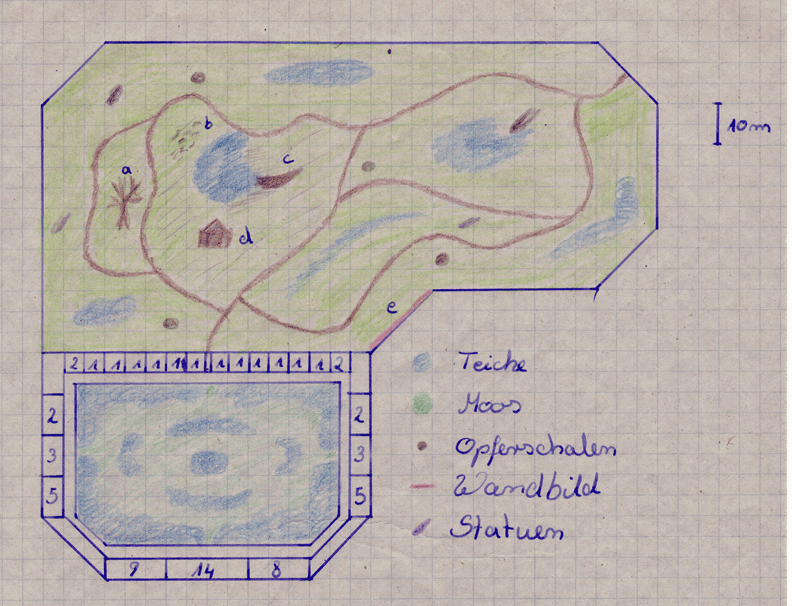 Dahinter erstreckt sich ein weitläufiger Park. Viele Wege und Pfade führen hindurch. Sie haben unterschiedliche Breiten. Manche sind mit Kies ausgestreut und sauber gerahmt, andere aus festgestampften Lehm, wieder andere bestehen aus Sand. Sie führen vorbei an Opferschalen, Ruheplätzen aus den unterschiedlichsten Materialien und einigen großen Darstellungen der Macht Belurs. Schließlich führt ein Weg zum Wohnkomplex der Priester.